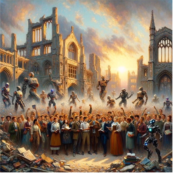 As such it doesn’t seem to be merely rhetorical flamboyance on my part to compare the arrival of GAI in Universities to the shock that nihilism was about to deliver in Nietzsche’s analysis. Those of us in Higher Education will have to face up to the fact that we are on the cusp of massive change, and that much of our current massified HE practice is not going to survive the next decade. We can bemoan this, and I am sure I’ll do some of that on occasion, but we can also greet this future with optimism. In this turbulence there is the opportunity to reevaluate all the values of our undertaking. What kind of Higher Education emerges, alongside a world where all kinds of AI have become increasingly pervasive, is not yet determined. It is an open field of terrifying, exhilarating and surprising possibility. The only thing I would suggest that is determined is that the University of the future will look very different to the University of today.